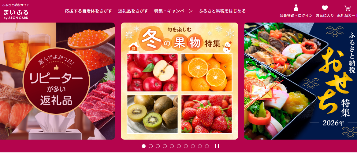 | 12位 | まいふる | 1,000 | - | WAON POINTが寄附に使える。イオンマークのカード利用でポイント基本2倍。 |