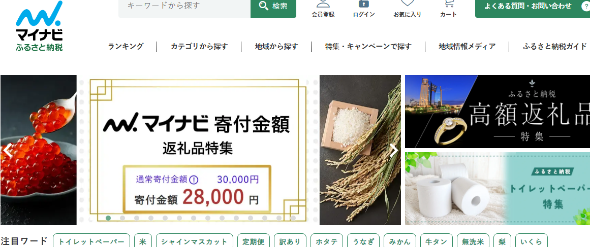 顧客満足度: マイナビが2022年に開始したサイトで、大手企業運営による信頼性が高く、安心して利用できます。返礼品や自治体の魅力を伝える特集記事(読み物)が充実しています。返礼品や自治体の魅力を伝える特集記事が充実しており、返礼品選びの参考になります。掲載自治体数は420、返礼品数は192,391件と他サイトに比べて少なめですが、質の高い情報が得られます。
