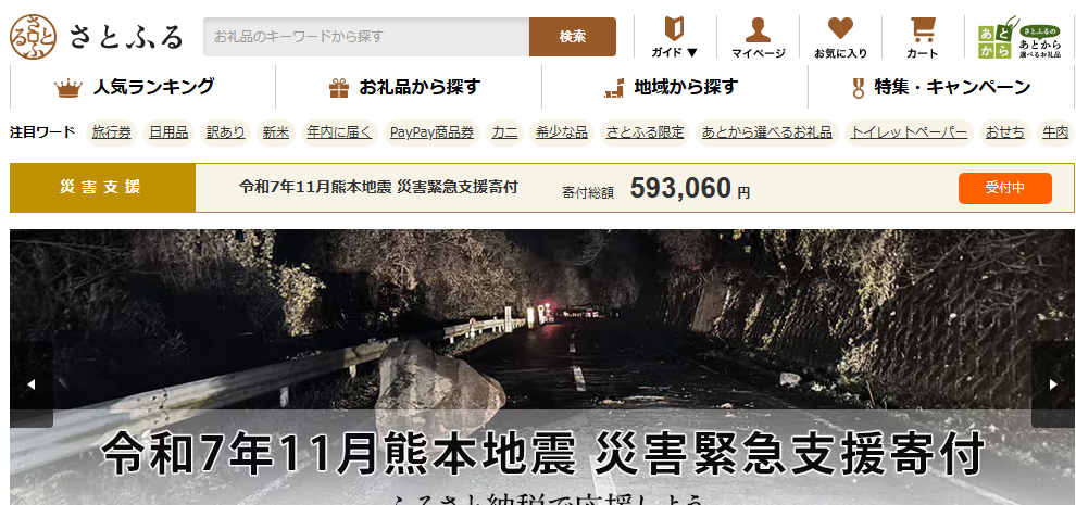 経済圏メリット: 楽天市場と同じ感覚で寄付ができ、楽天ポイントを寄付に利用したり(ポイント支払い)、貯めたりできます。楽天カードや大規模キャンペーン(お買い物マラソンなど)と組み合わせることで、実質還元率を最大化しやすいのが特徴です。また、楽天トラベルで使えるクーポンを返礼品として提供しています。